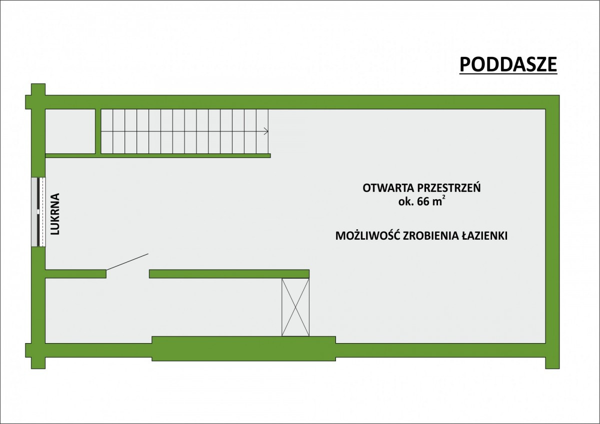Otwarta przestrzeń około 60m ze skosami, możliwość zrobienia łazienki i wydzielenia dwóch sypialni.