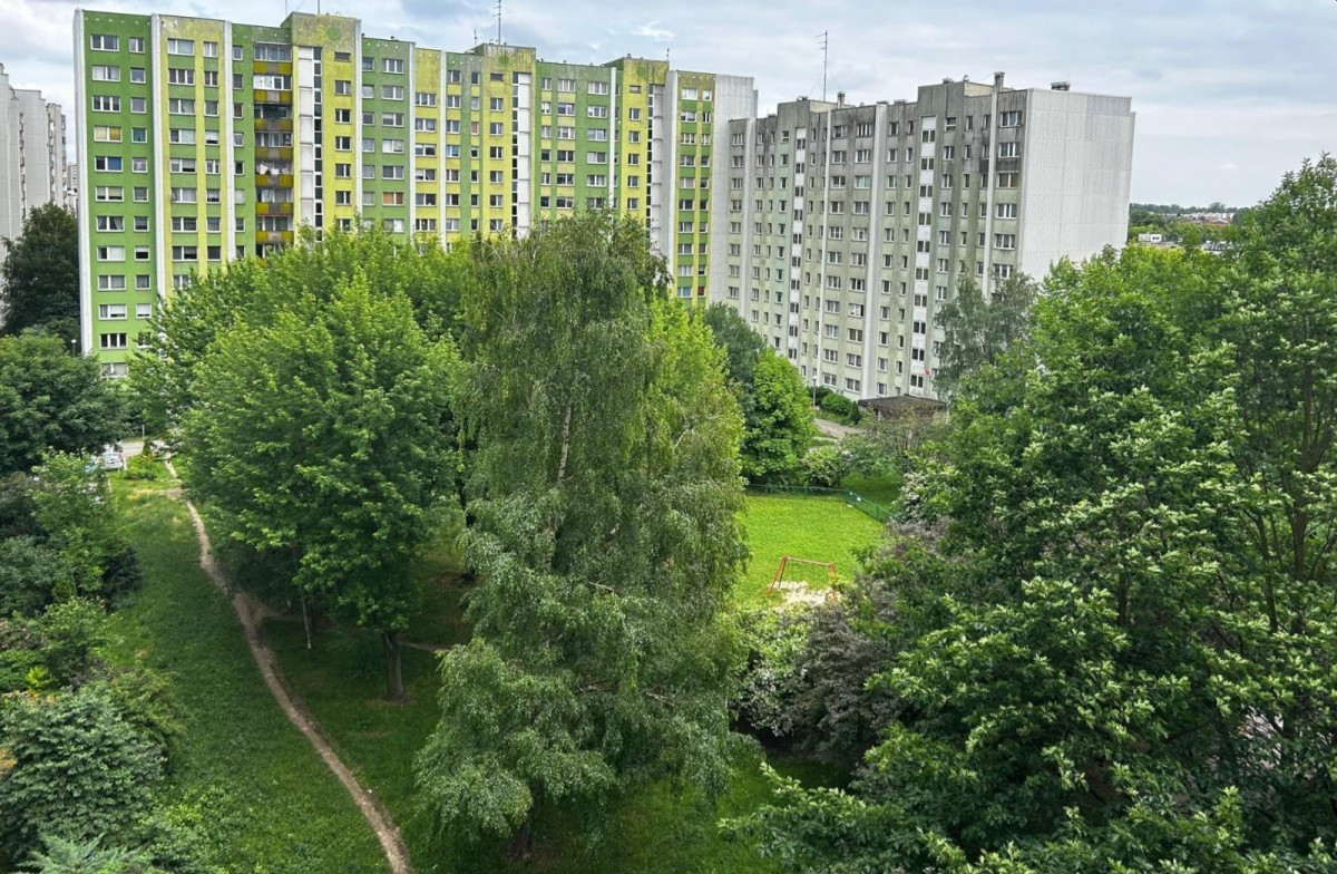 Budynek 12-piętrowy z 1979 r. (wielka płyta), zadbany, otoczony zielenią