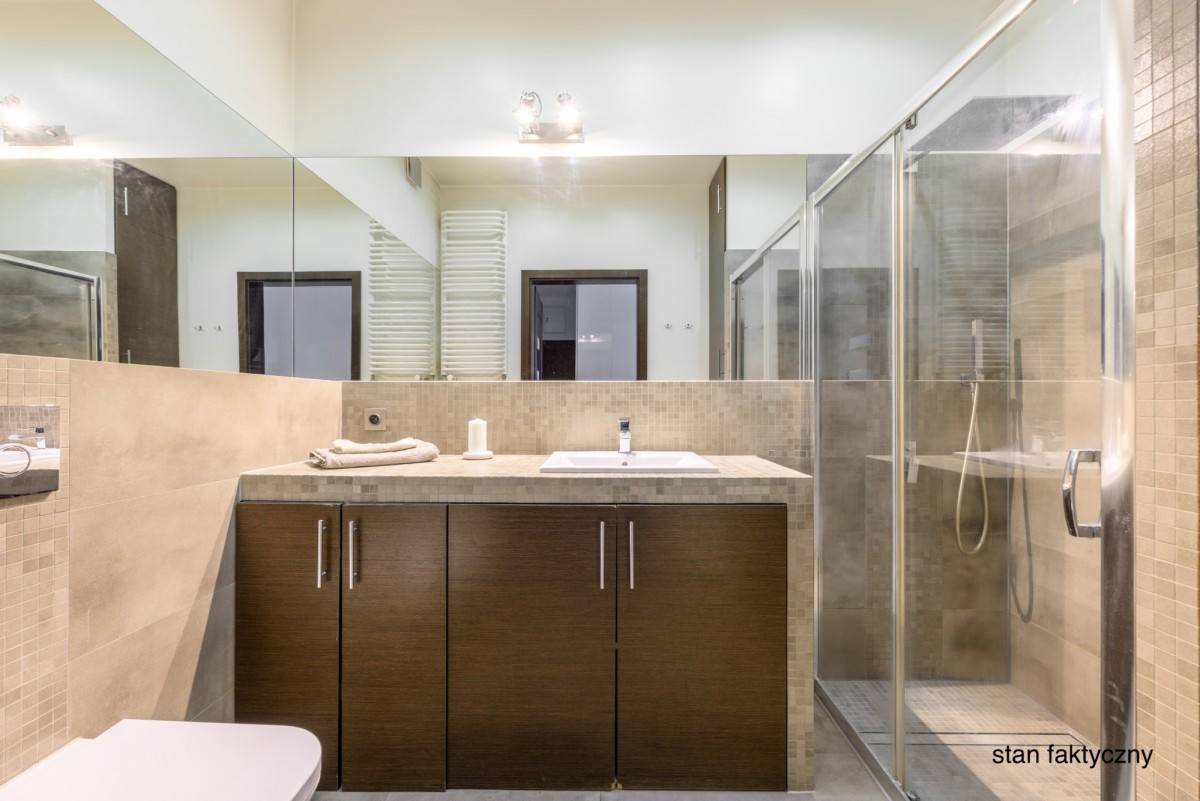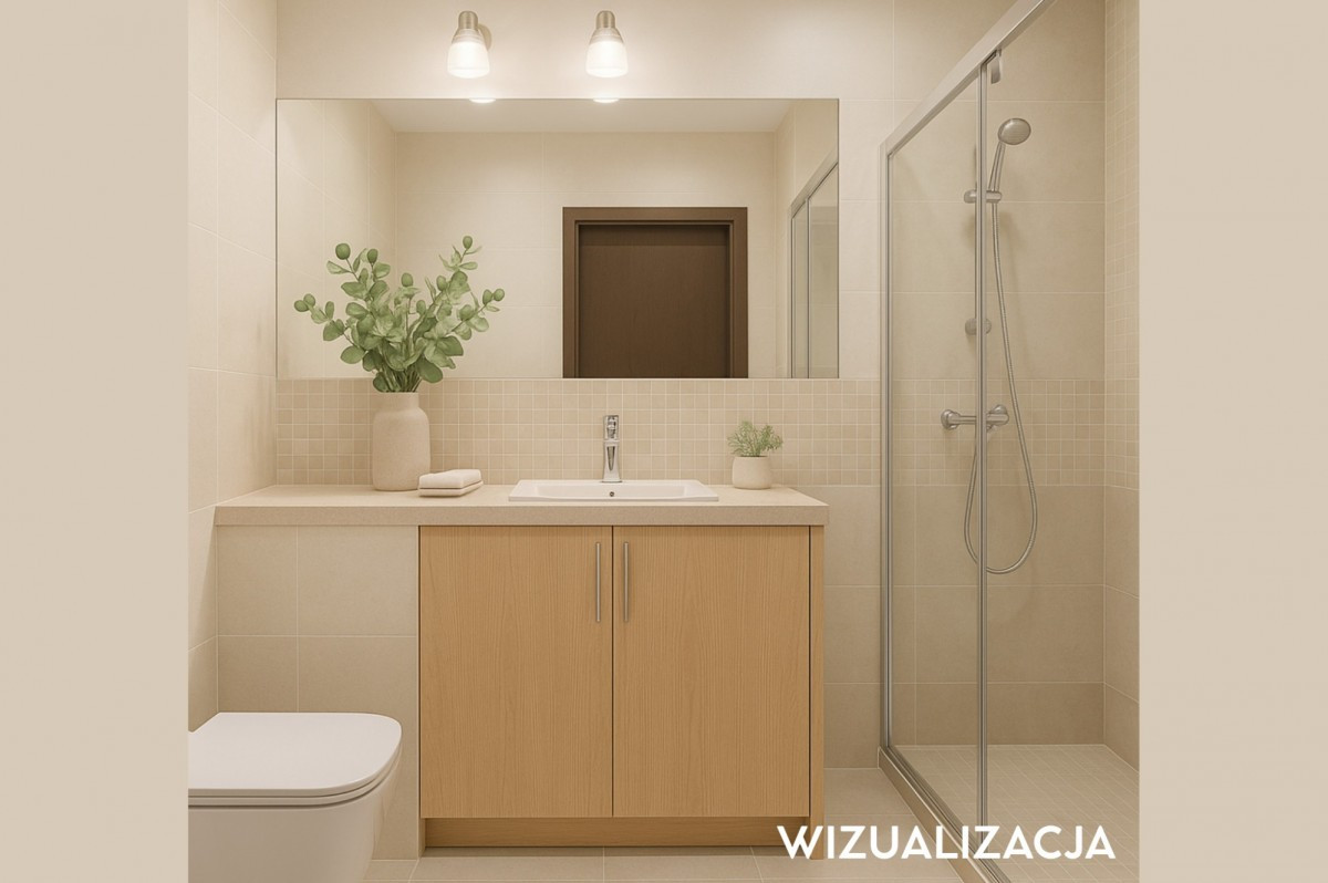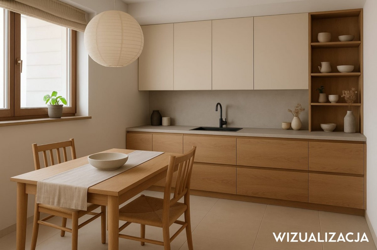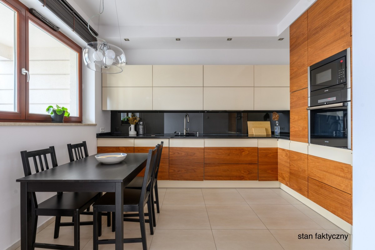 Kuchnia w zabudowie, w pełni wyposażona w sprzęt AGD: zmywarkę, piekarnik, mikrofalę, płytę i lodówkę. W korytarzu znajduje się pojemna szafa wnękowa oraz praktyczne pomieszczenie gospodarcze. Łazienka z prysznicem.