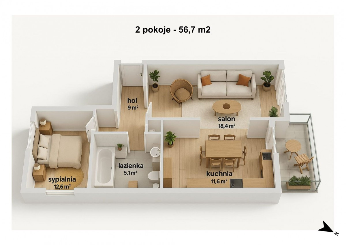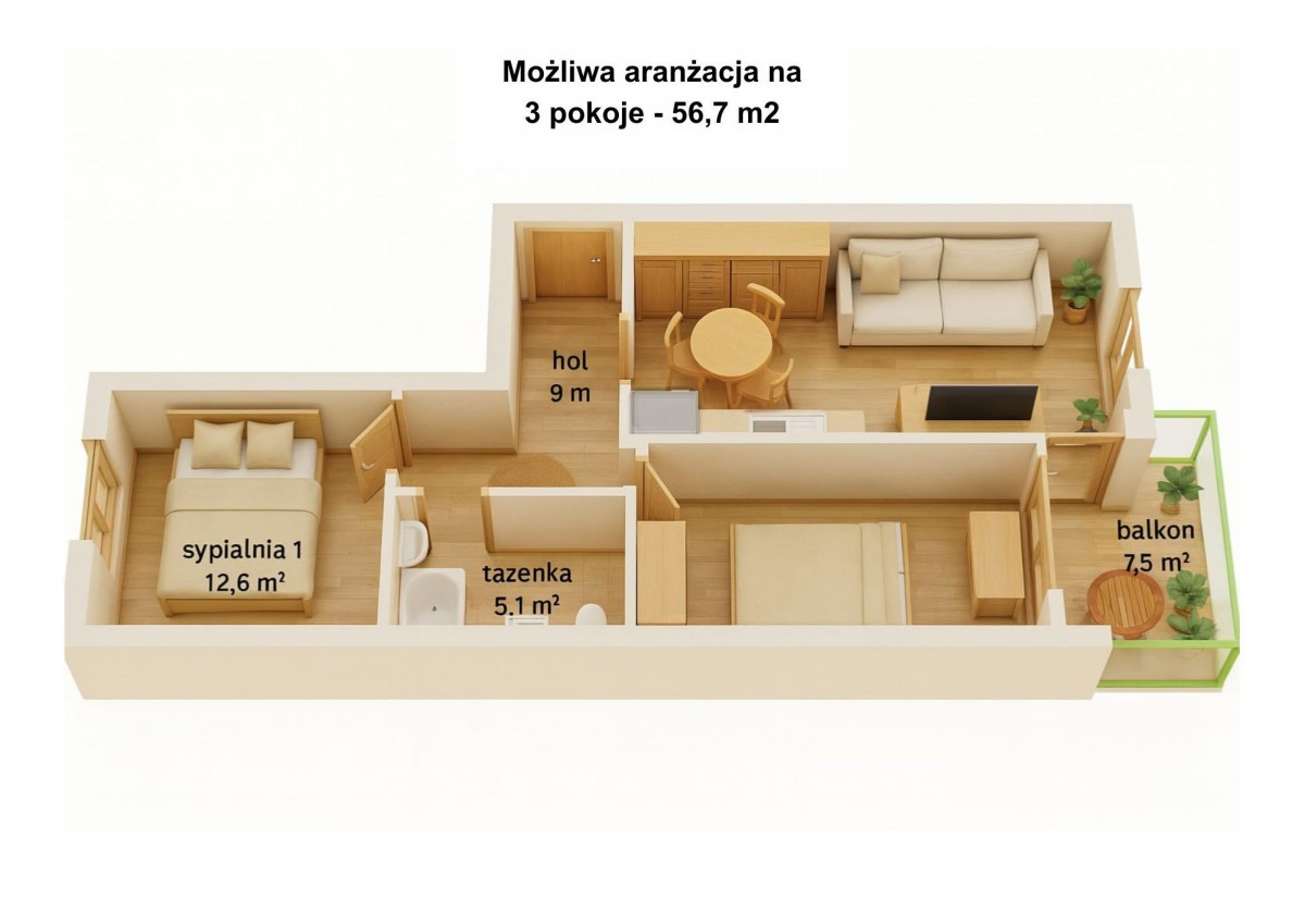 Przestronne, dwustronne dobrze doświetlone wnętrze o metrażu 56,7 m² z loggią ok. 7,5 m². Obecnie mieszkanie składa się z salonu, osobnej kuchni, sypialni i łazienki, ale układ pozwala łatwo wydzielić trzy funkcjonalne pokoje (na rzucie i wizualizacji pokazane są dwa warianty aranżacji). Można zachować obecny układ po odświeżeniu lub całkowicie zmienić go według własnego pomysłu.