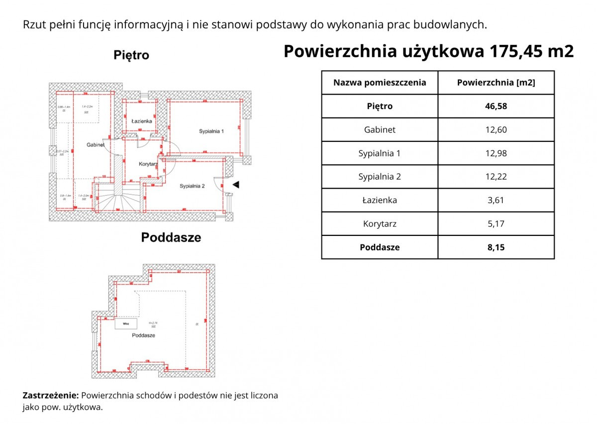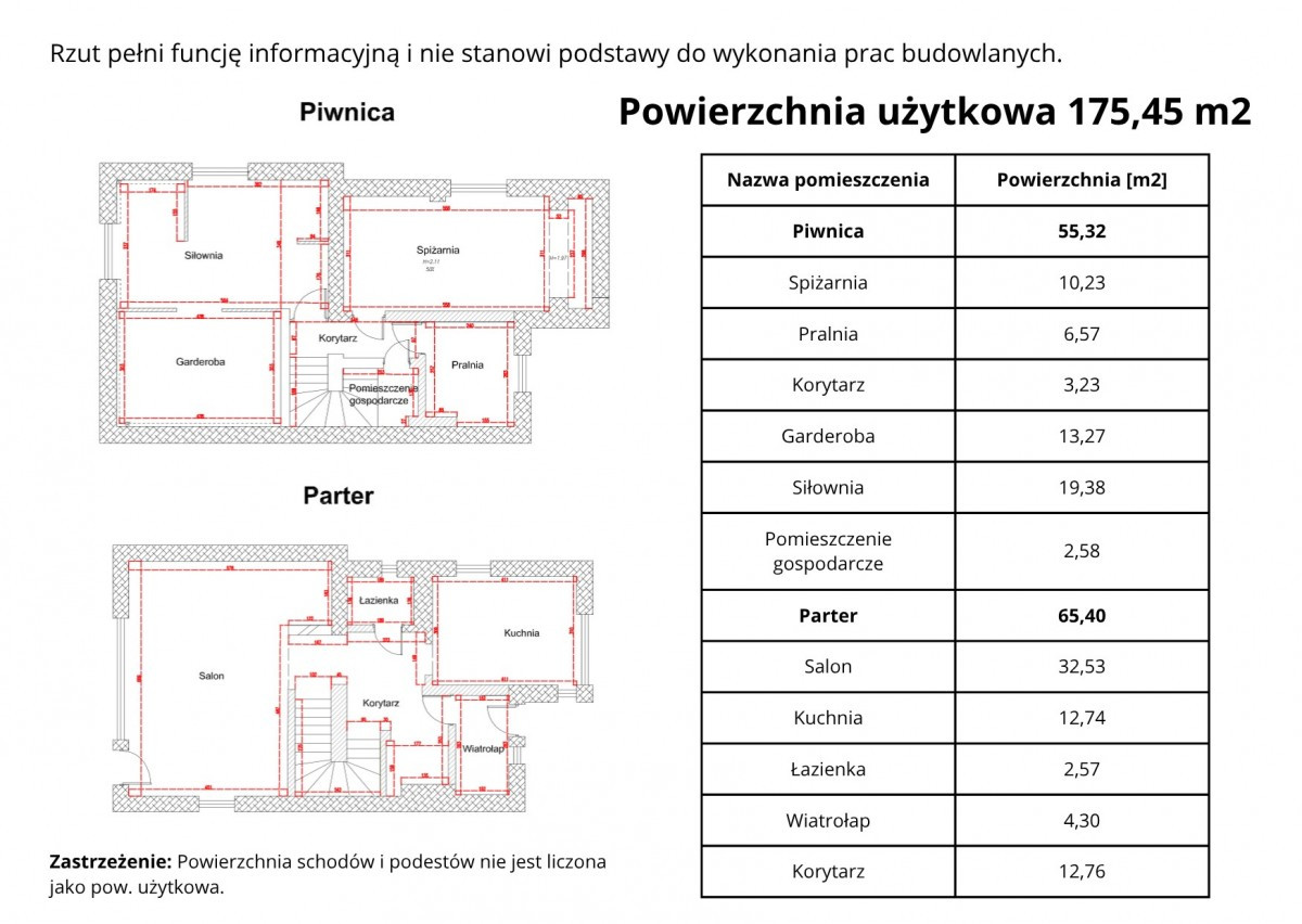 Piwnica - 55,32 m2, parter - 65,40 m2, piętro - 46,58 m2, poddasze - 8,15 m2 pow. użytkowej