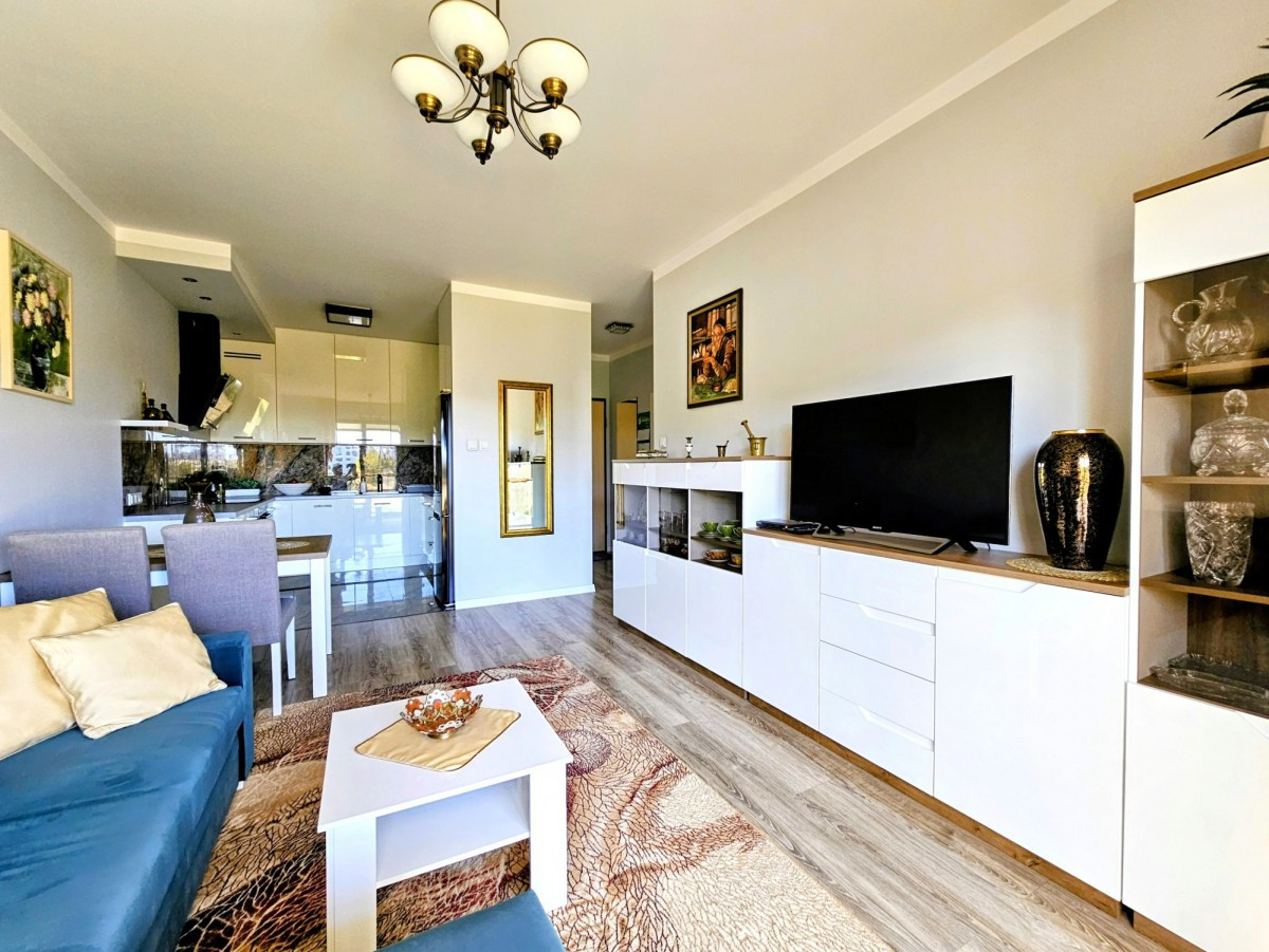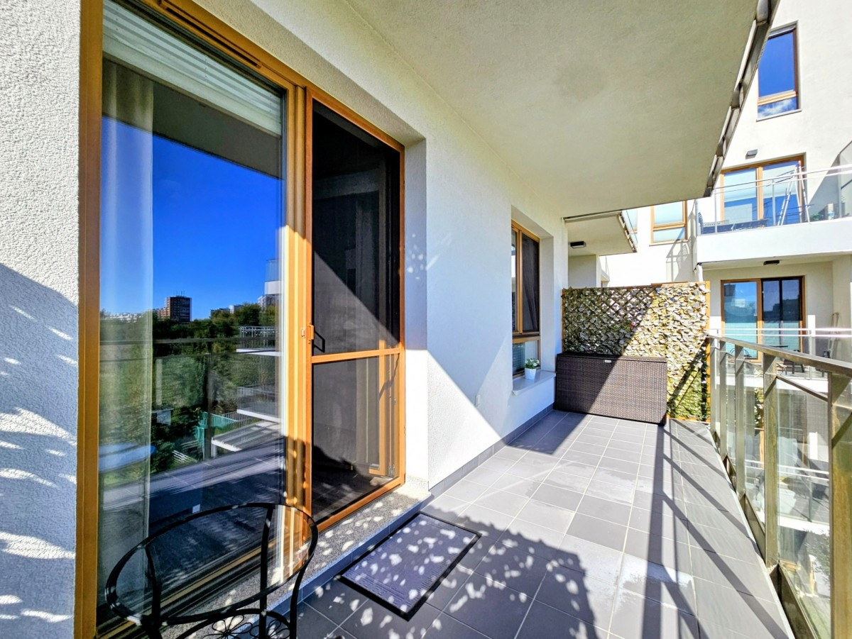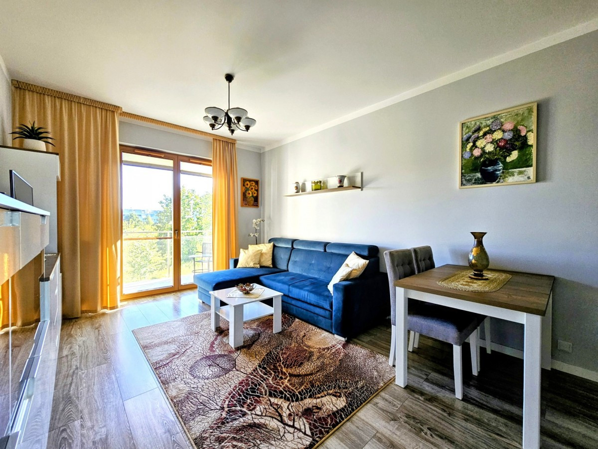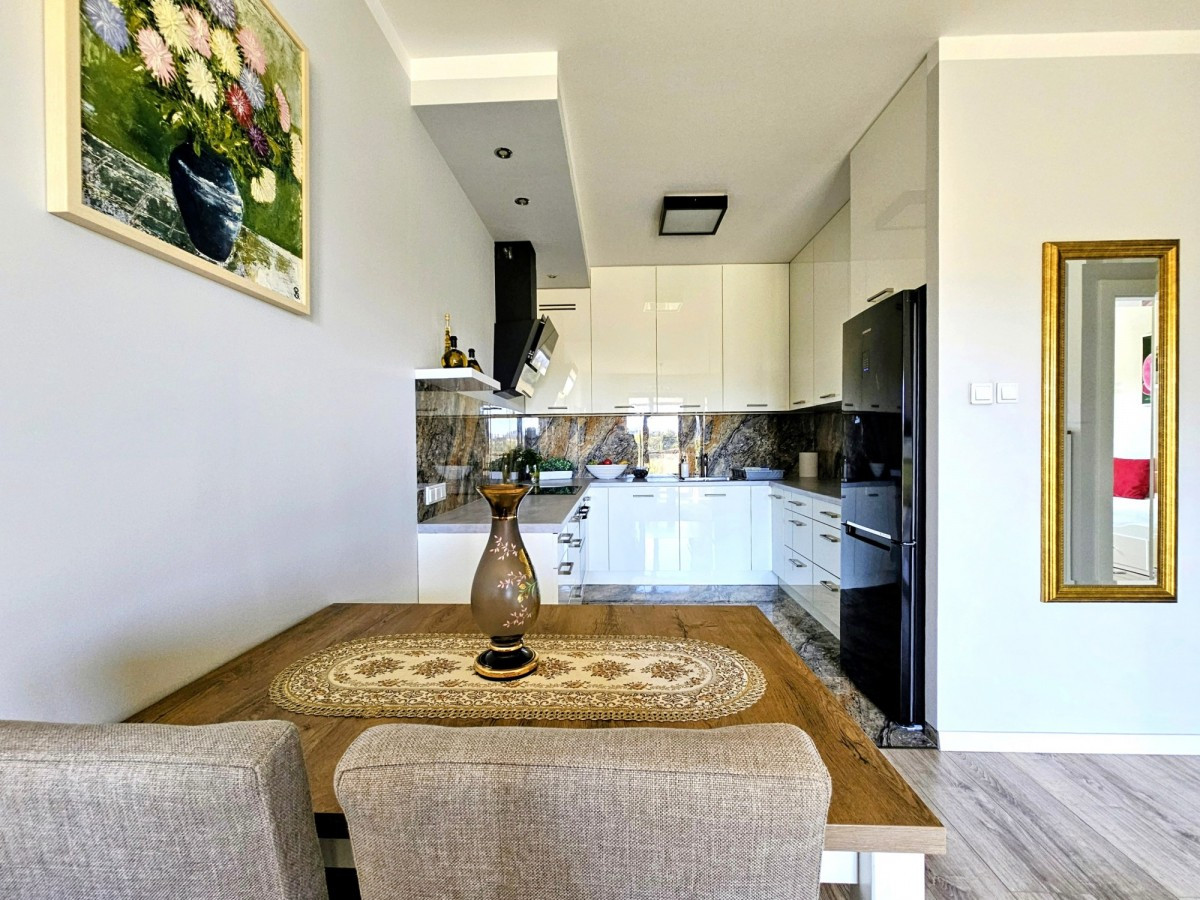 Na sprzedaż dwupokojowe mieszkanie z aneksem kuchennym oraz ogromnym balkonem i przestrzennym widokiem, zlokalizowane na drugim piętrze eleganckiego niskiego apartamentowca.