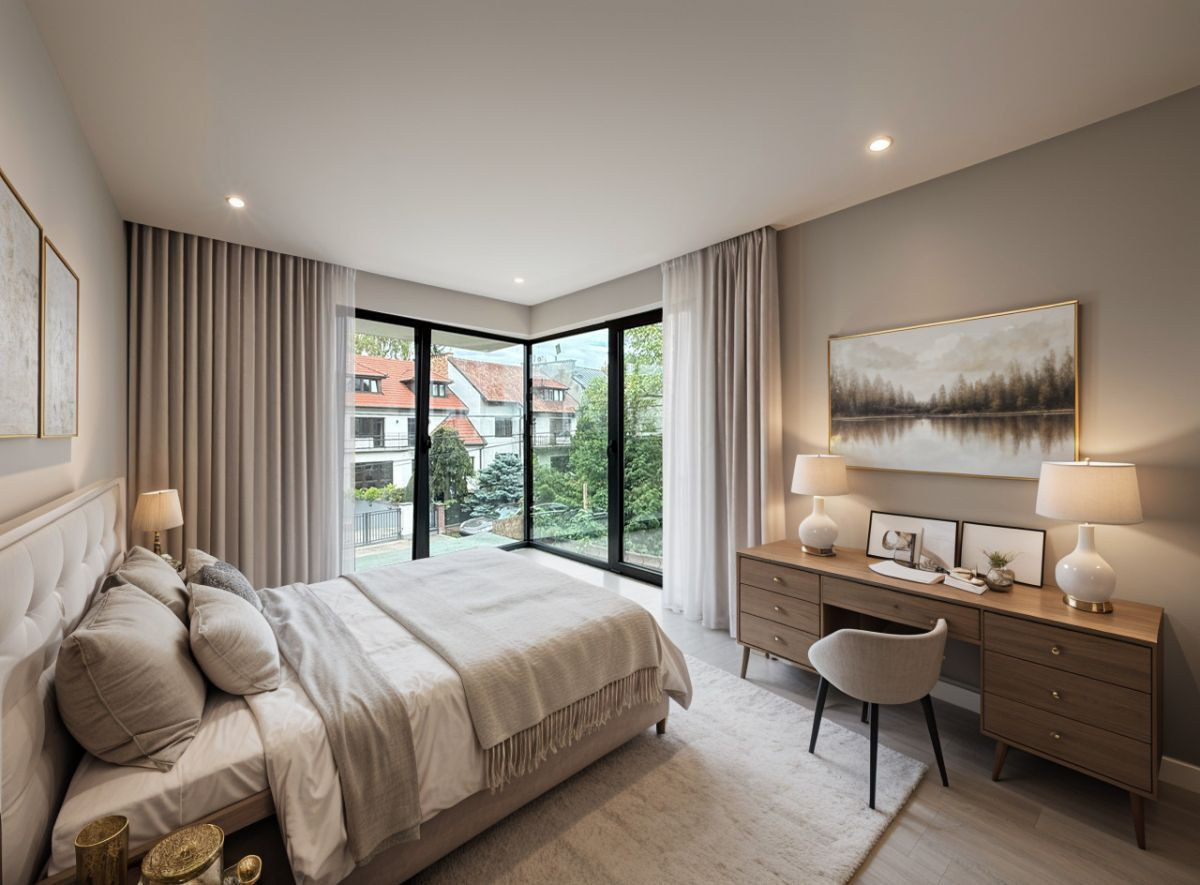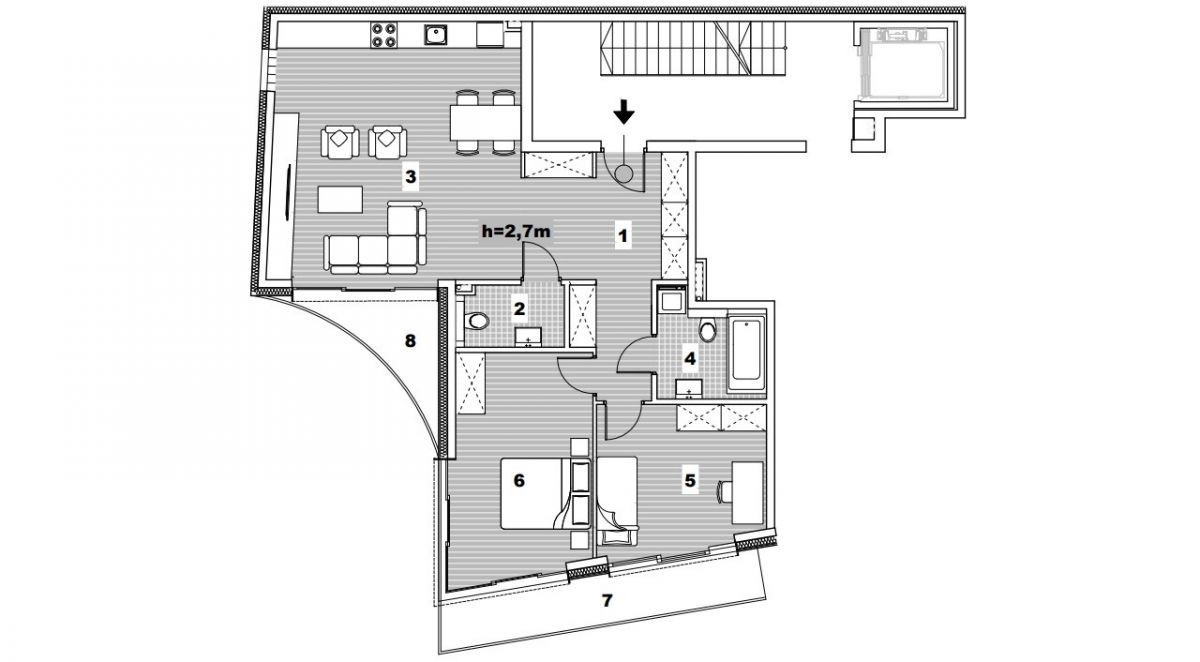 Z mieszkania wychodzą dwa balkony, jeden na stronę północną, drugi na północno-wschodnią. Dzięki dużym przeszkleniom mieszkanie jest bardzo dobrze doświetlone, a z okien rozpościera się widok na zieleń.