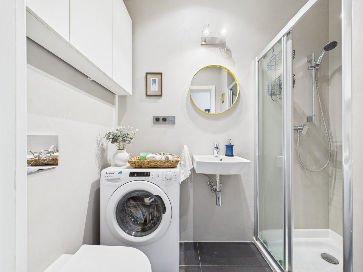Łazienka (ok. 5 m2) wyposażona w prysznic i pralkę,