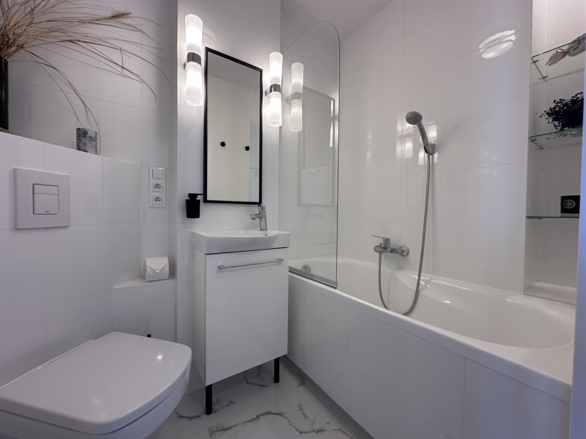 W łazience znajduje się wanna, umywalka z szafką, wc i dodatkowa szafka na przybory i kosmetyki.