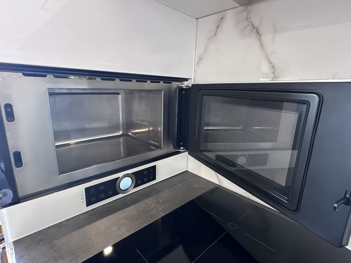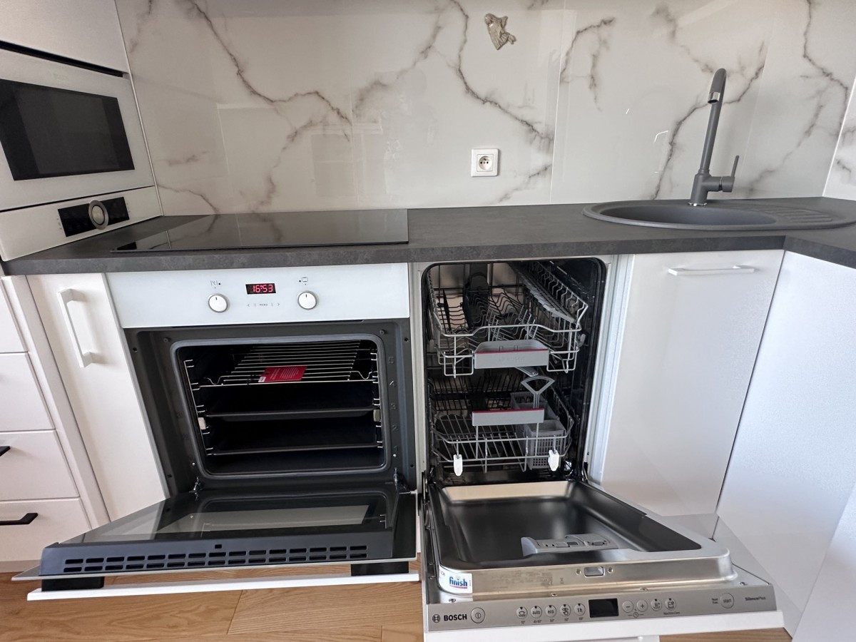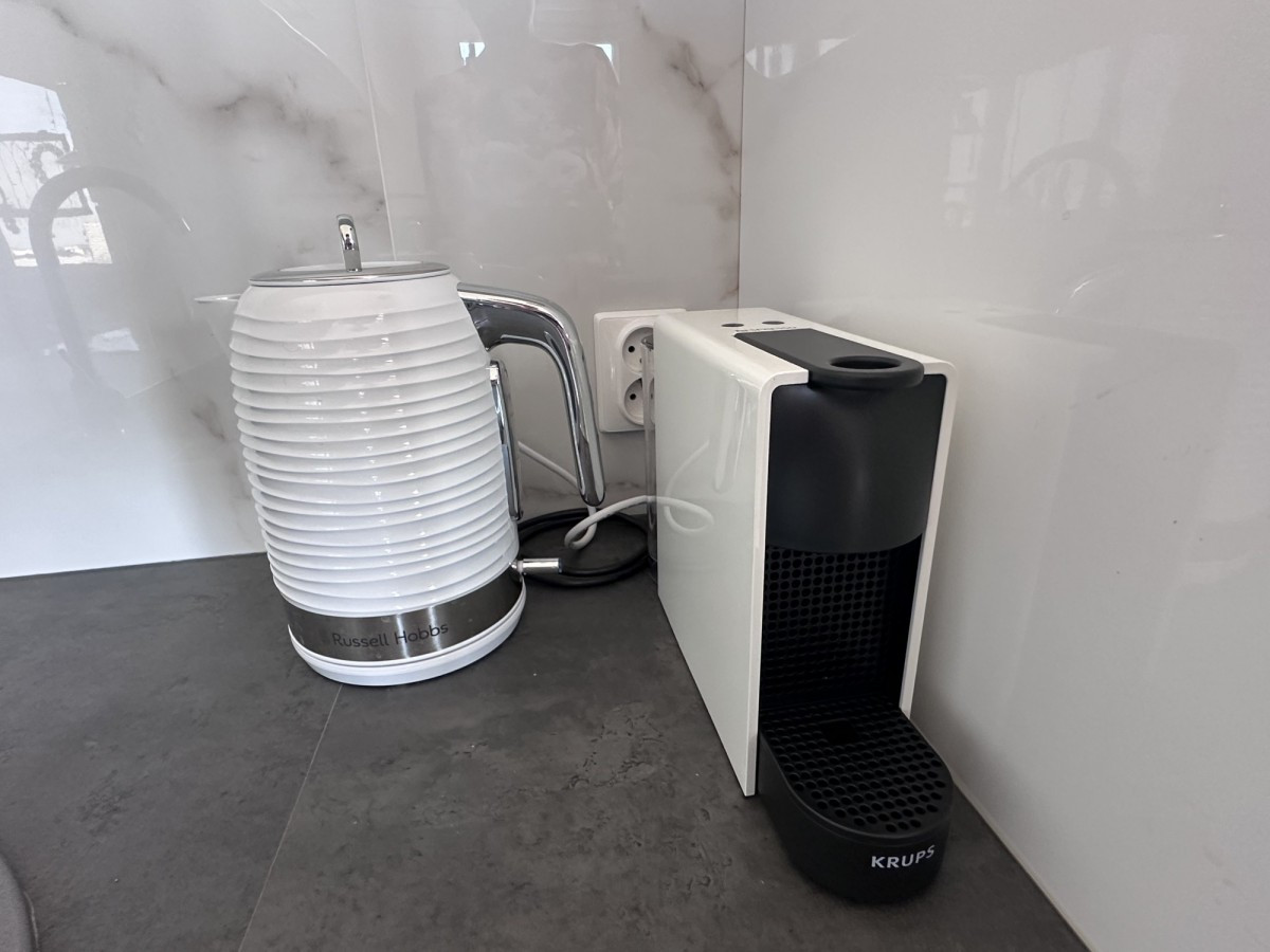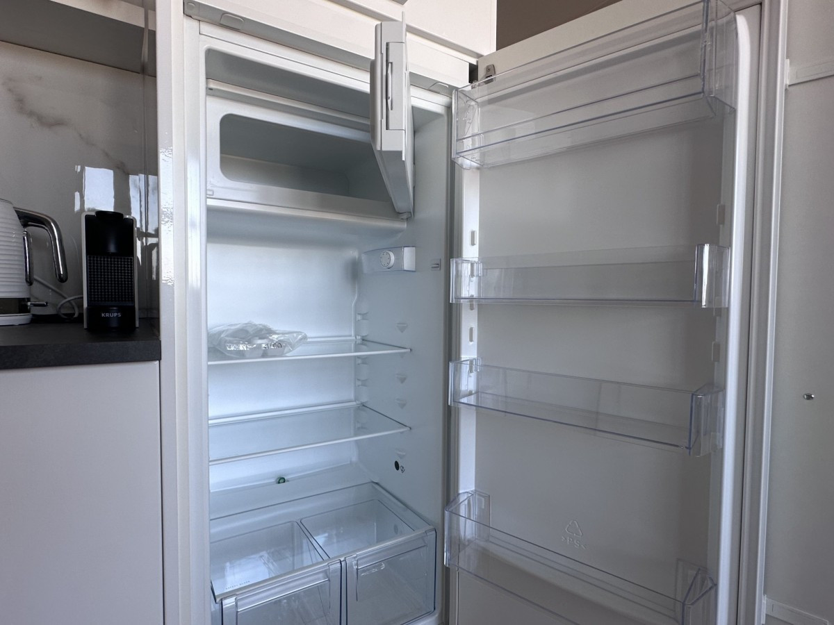 Kuchnia wyposażona w dużą lodówkę, płytę indukcyjną, okap, piekarnik, czajnik, ekspres, mikrofalę, naczynia.