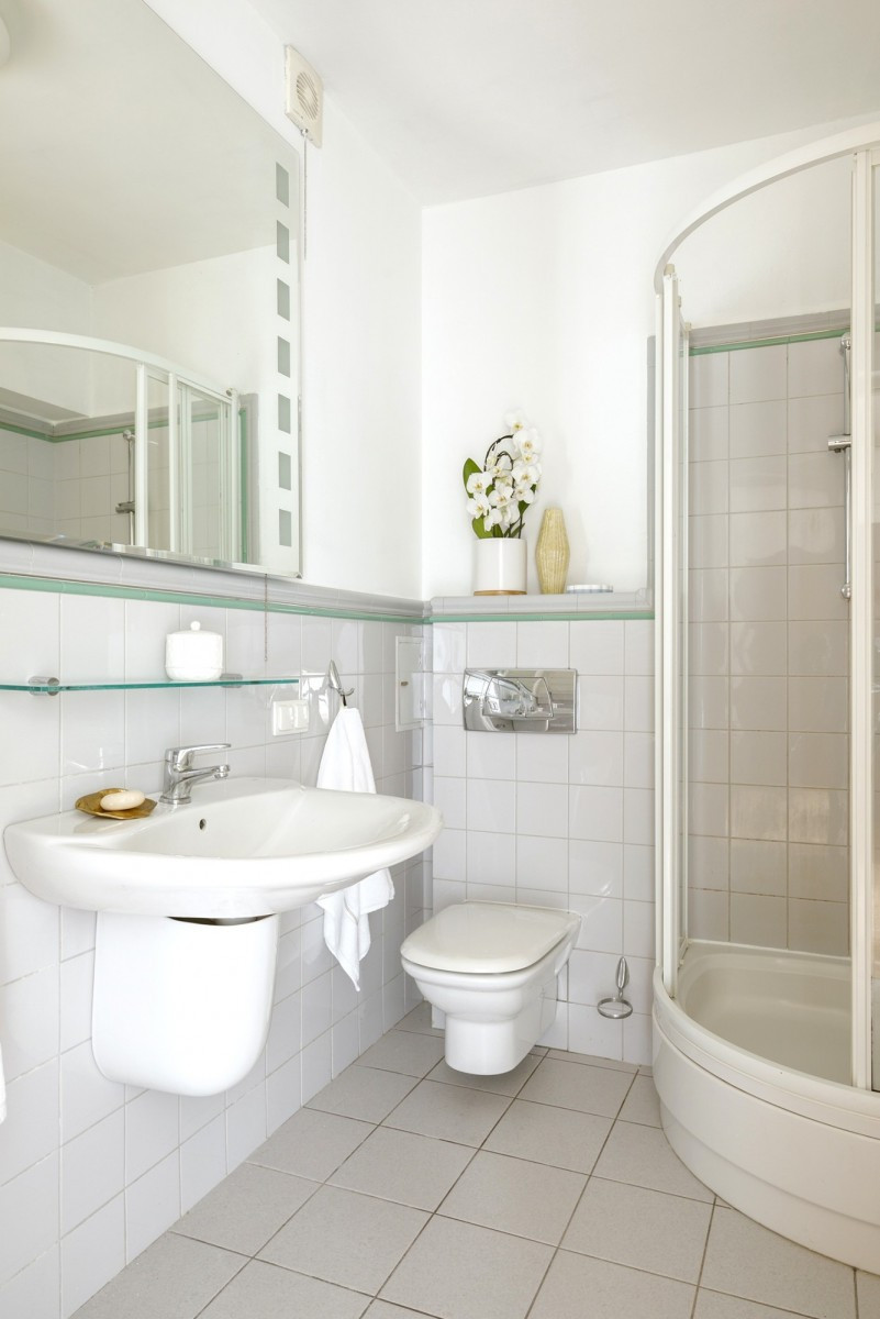 W łazience znajduje się prysznic, WC, umywalka i sporo miejsca na przechowywanie kosmetyków oraz środków czystości.