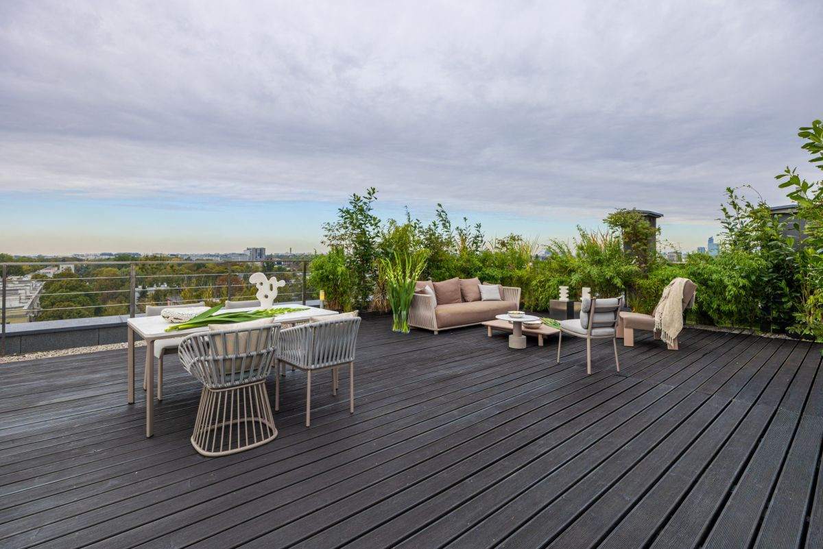 Największą perłą jest ponad 160-metrowy taras na dachu, z którego rozpościera się niezmienny, panoramiczny widok na miasto i zieleń Górnego Mokotowa. To przestrzeń tak wyjątkowa, że oferuje doświadczenie prywatności, spokoju i swobody, którego nie znajdzie się w żadnym innym apartamencie w Warszawie.